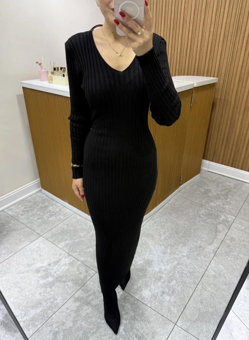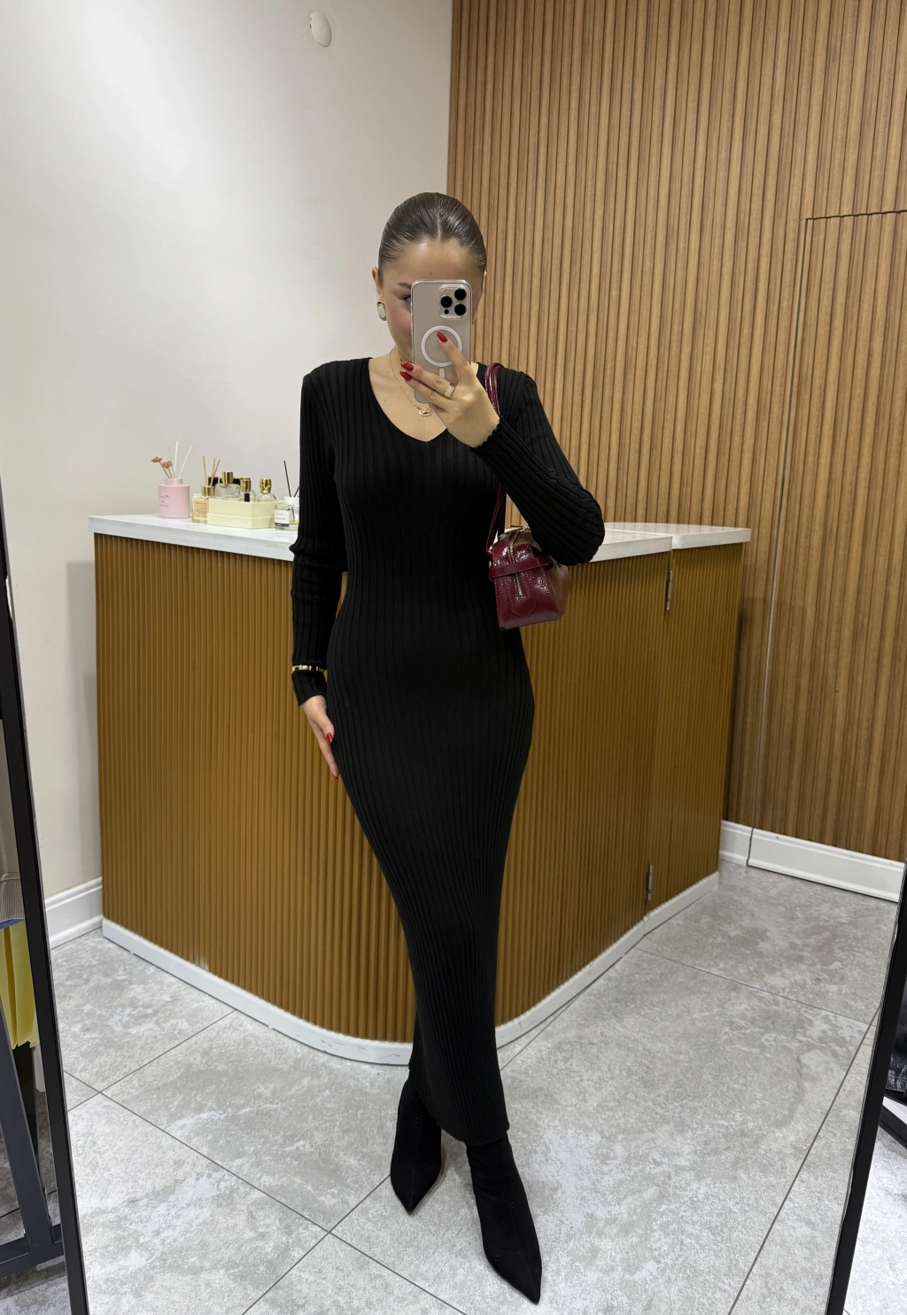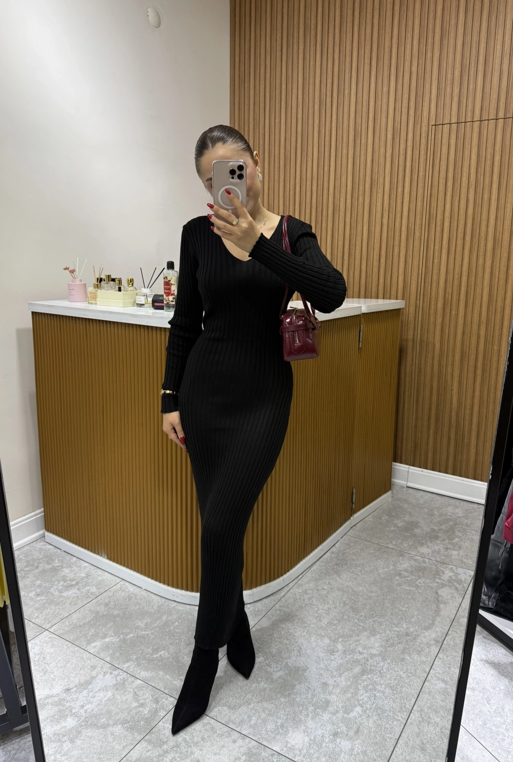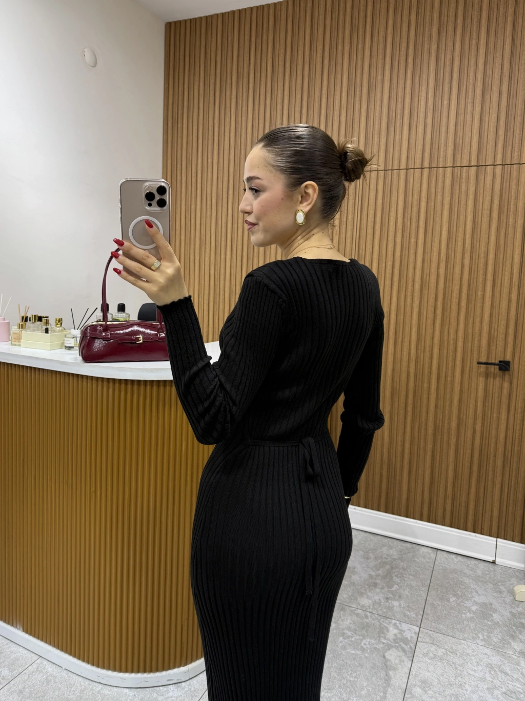 Arkadan Bağlama Detaylı Triko Elbise Siyah