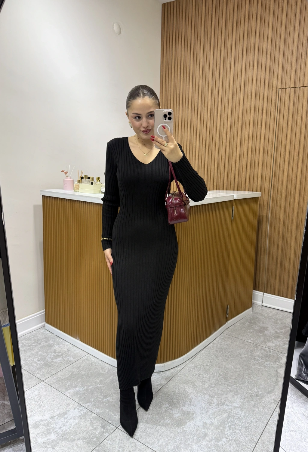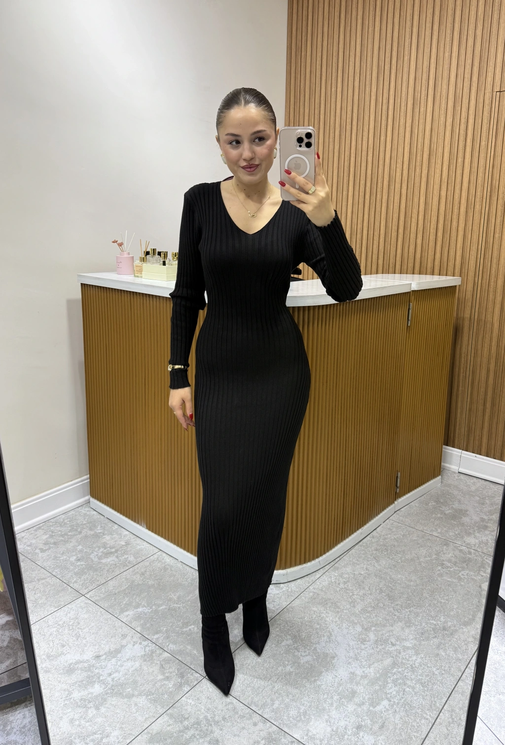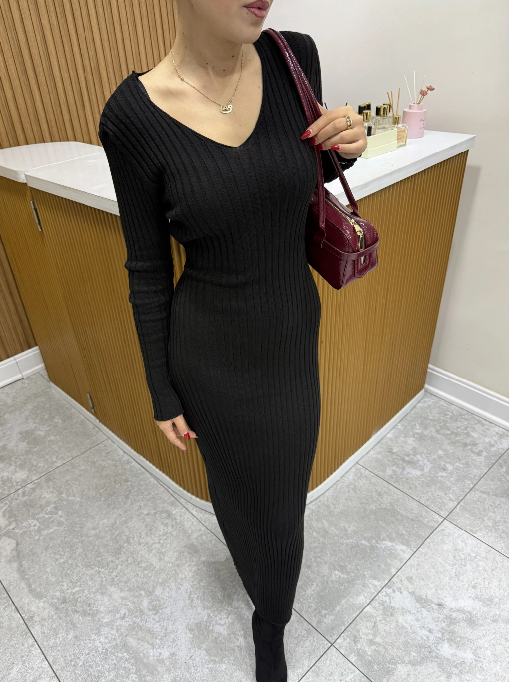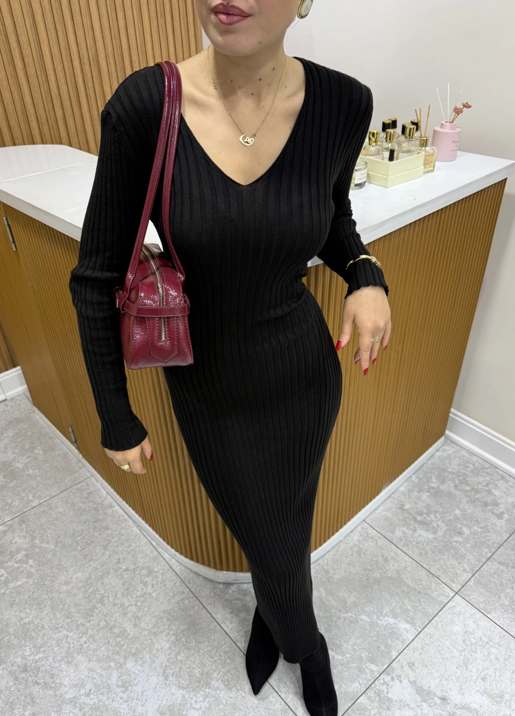 Arkadan Bağlama Detaylı Triko Elbise Siyah