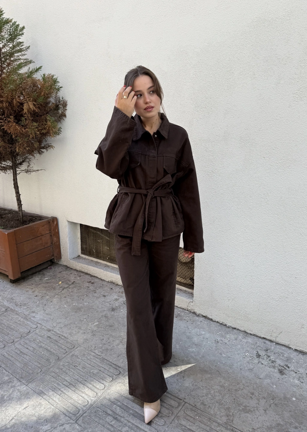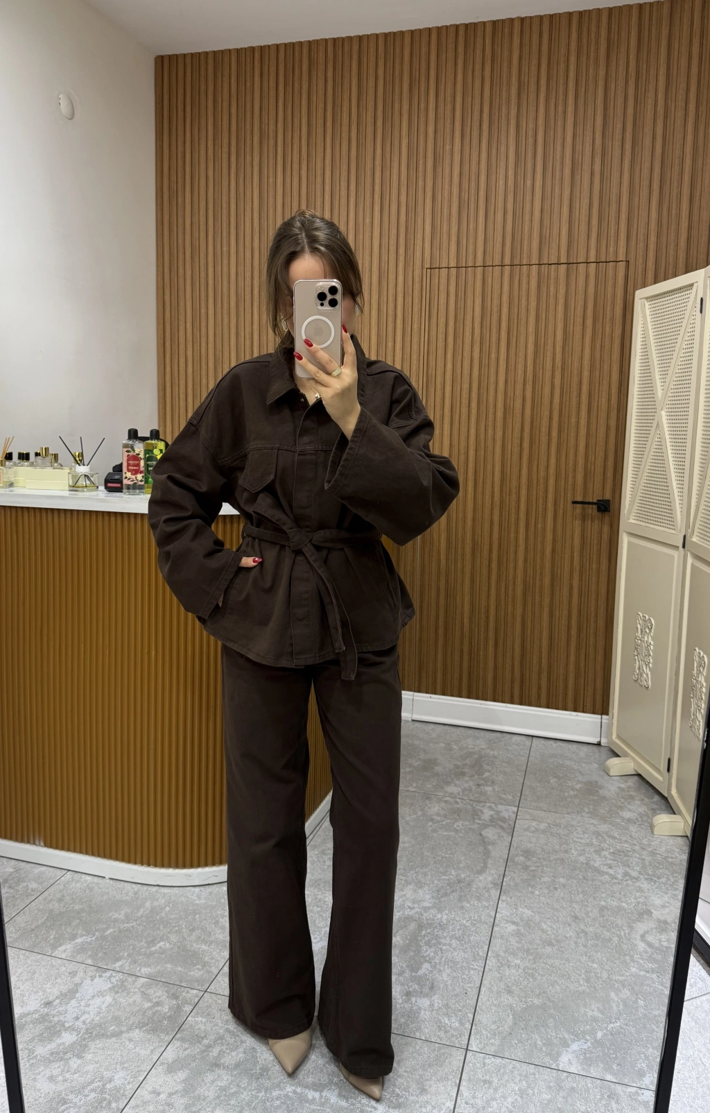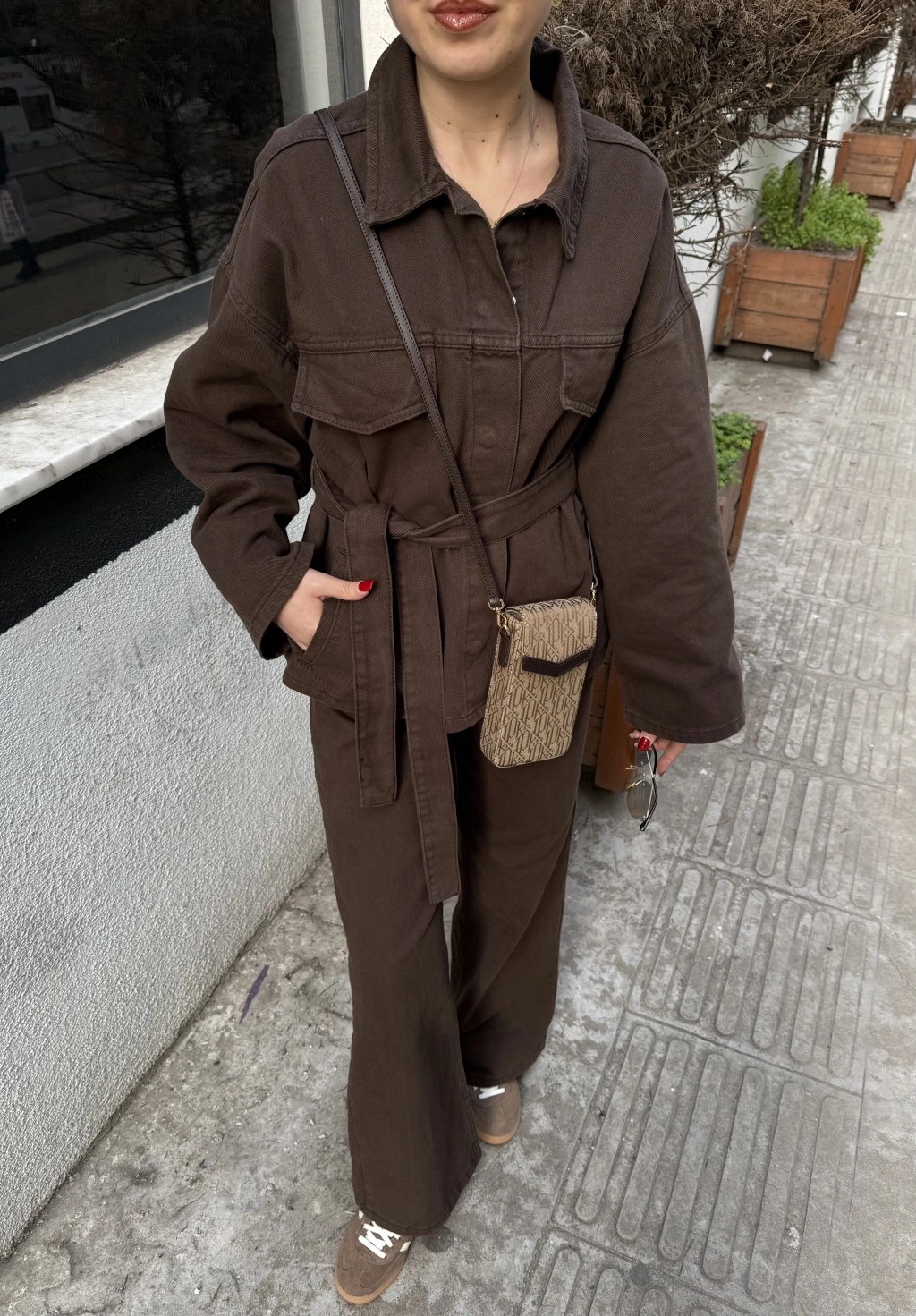 Beli Kuşaklı Ceket Pantolon Kahve Takım