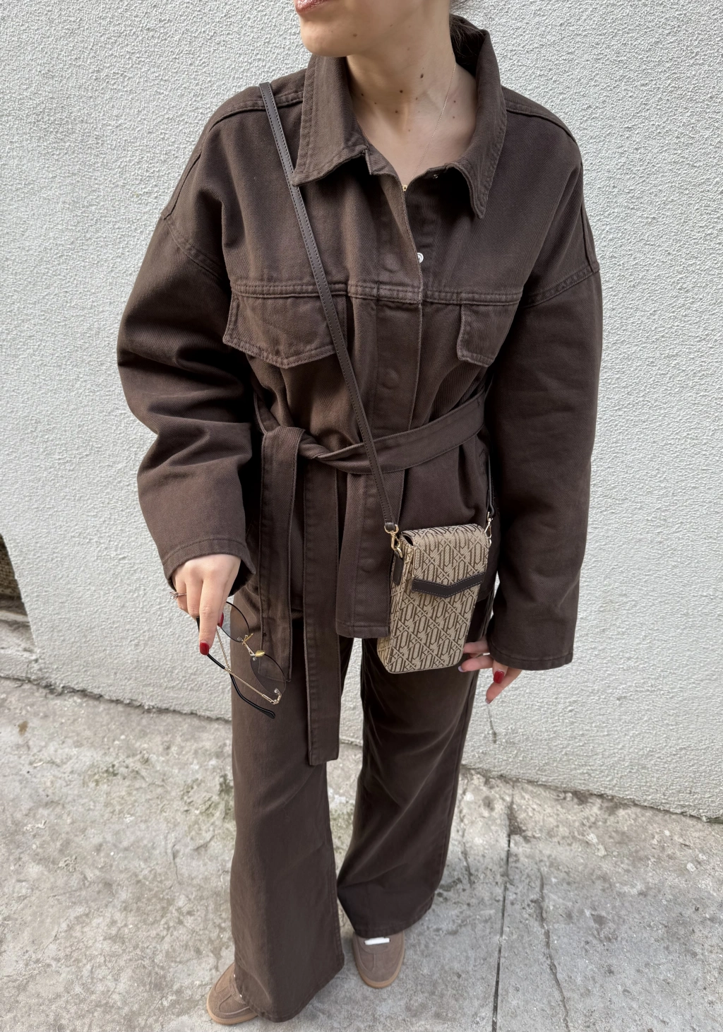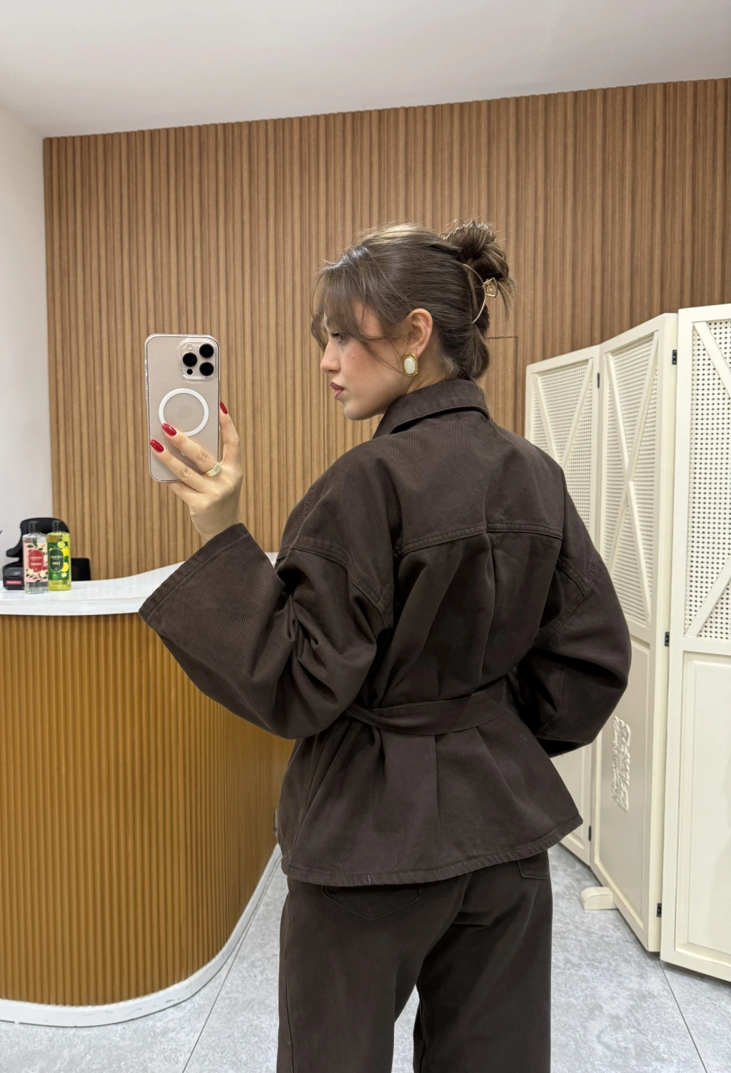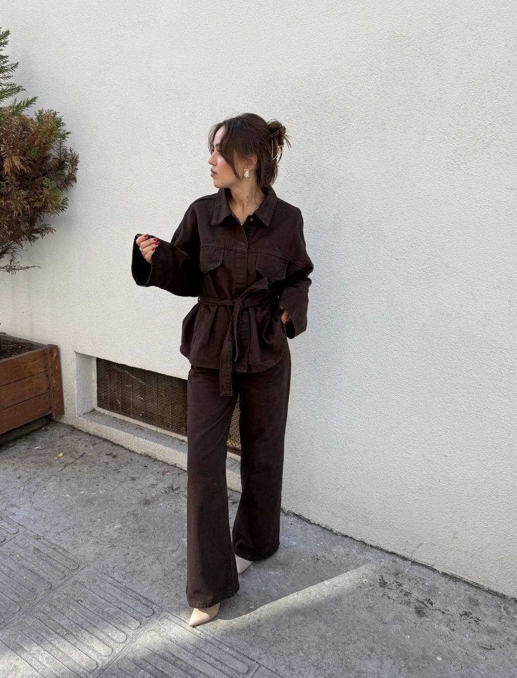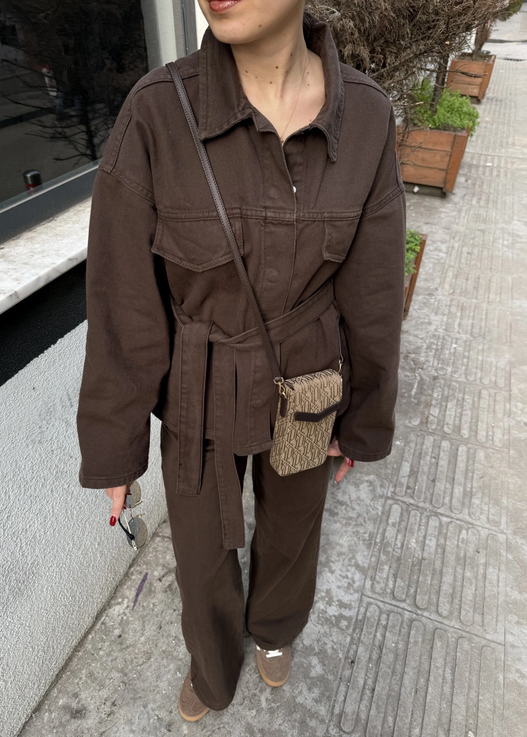 Beli Kuşaklı Ceket Pantolon Kahve Takım