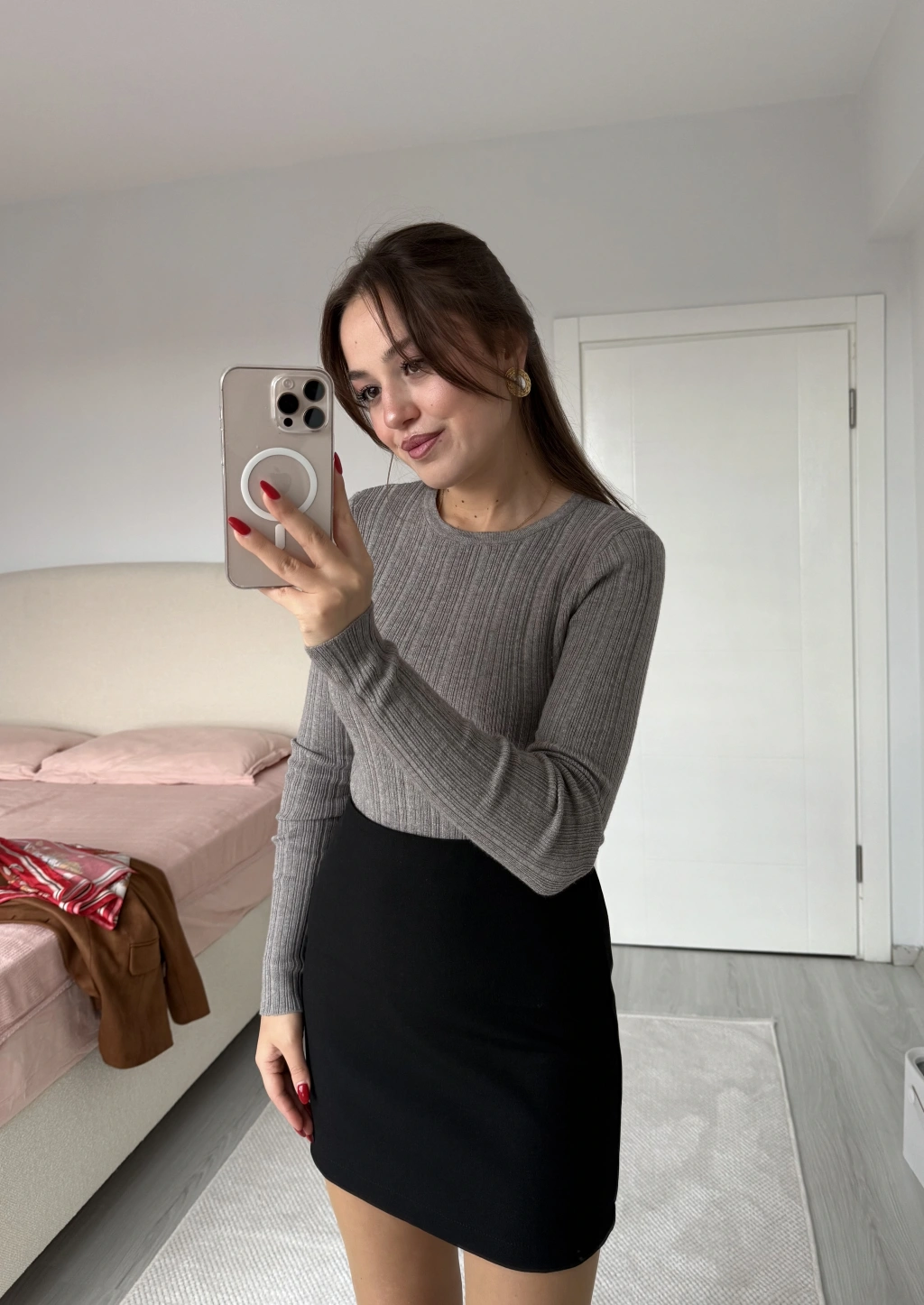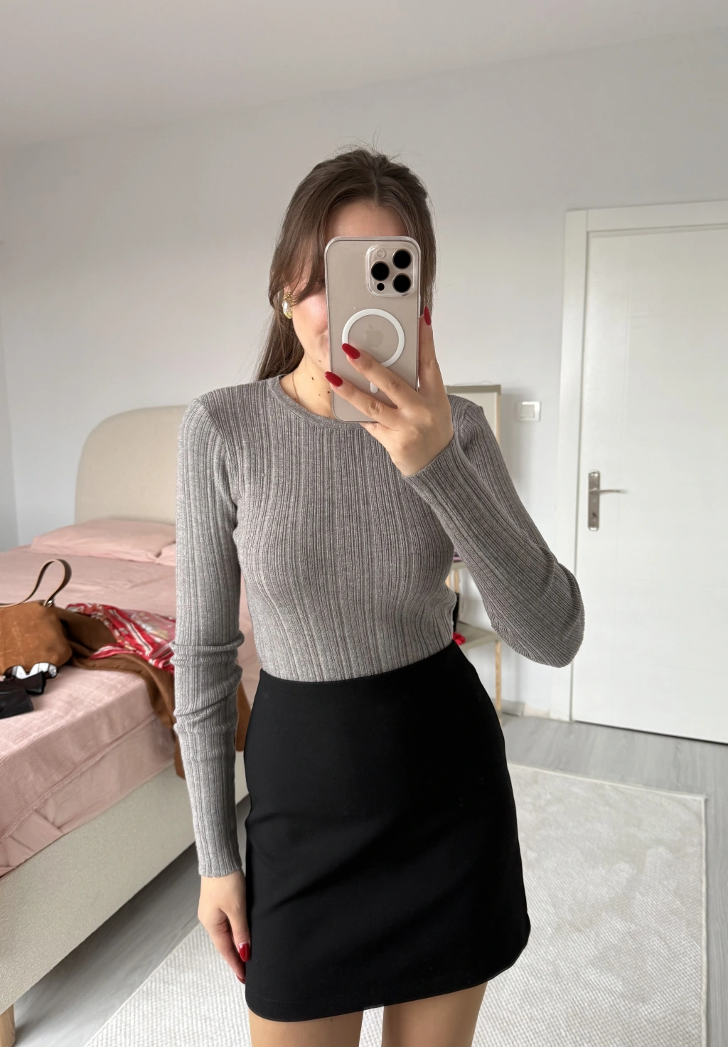 Bisiklet Yaka Fitilli Örgü Kazak Gri