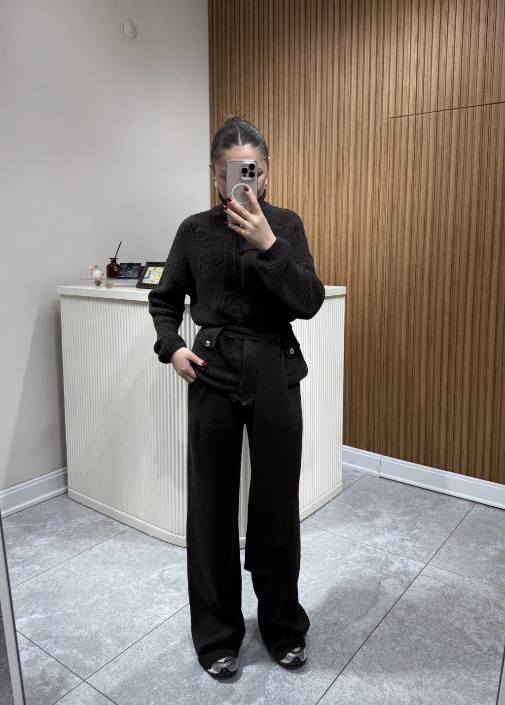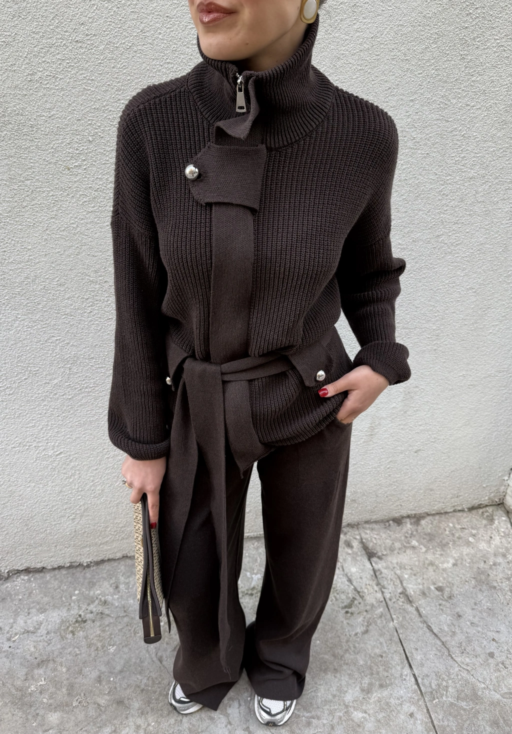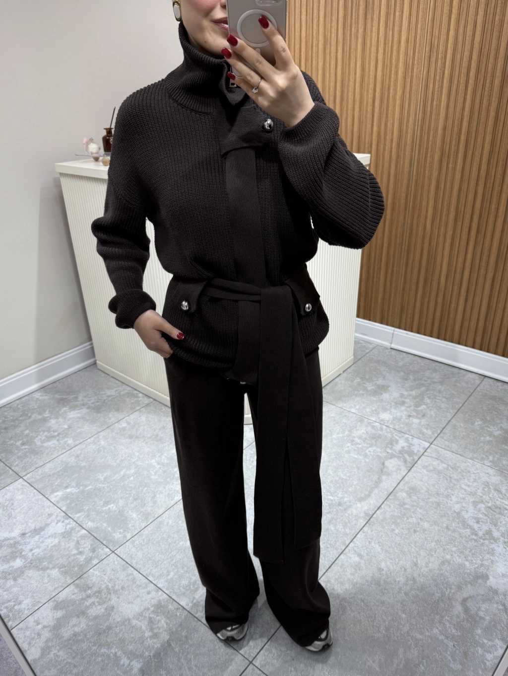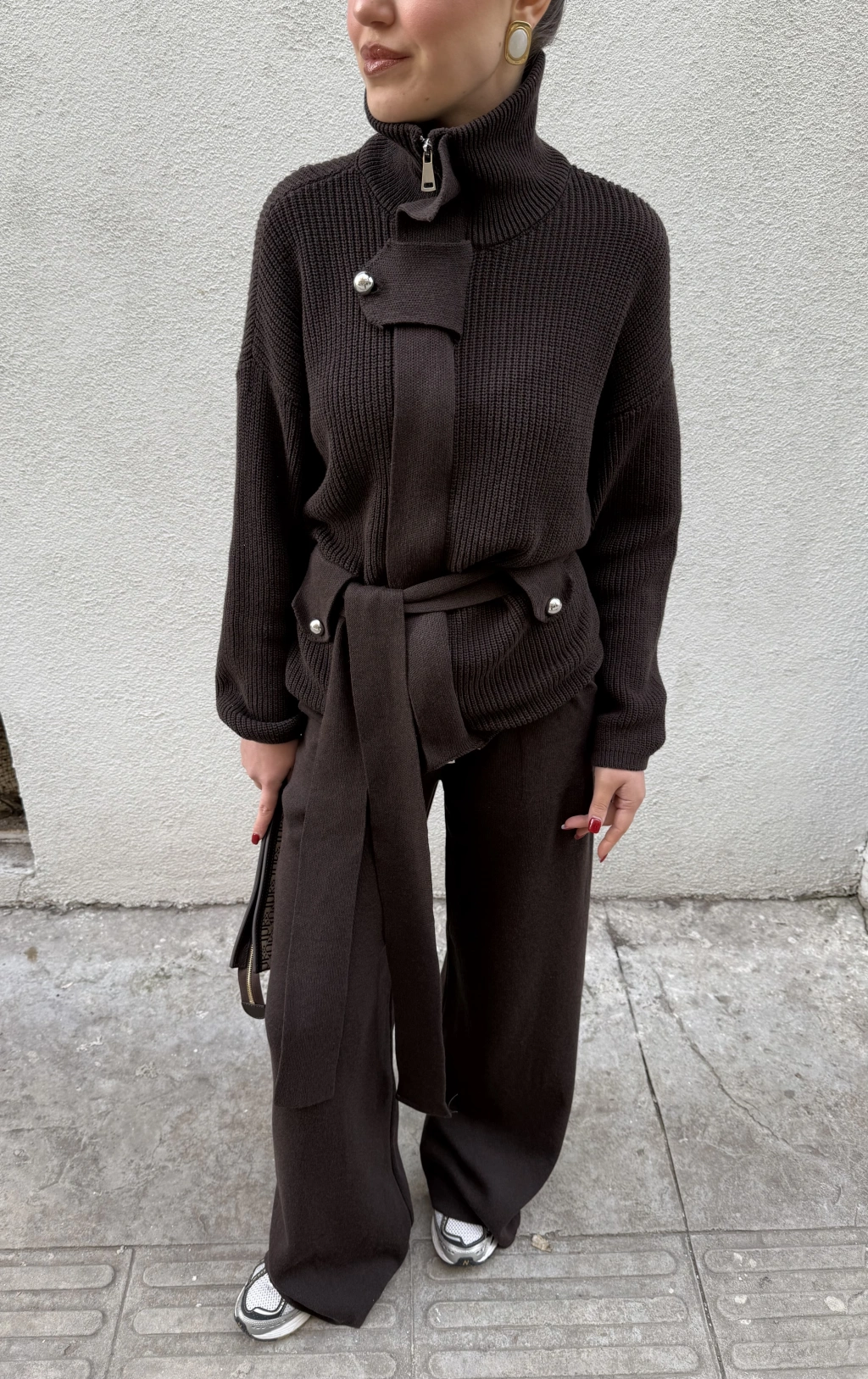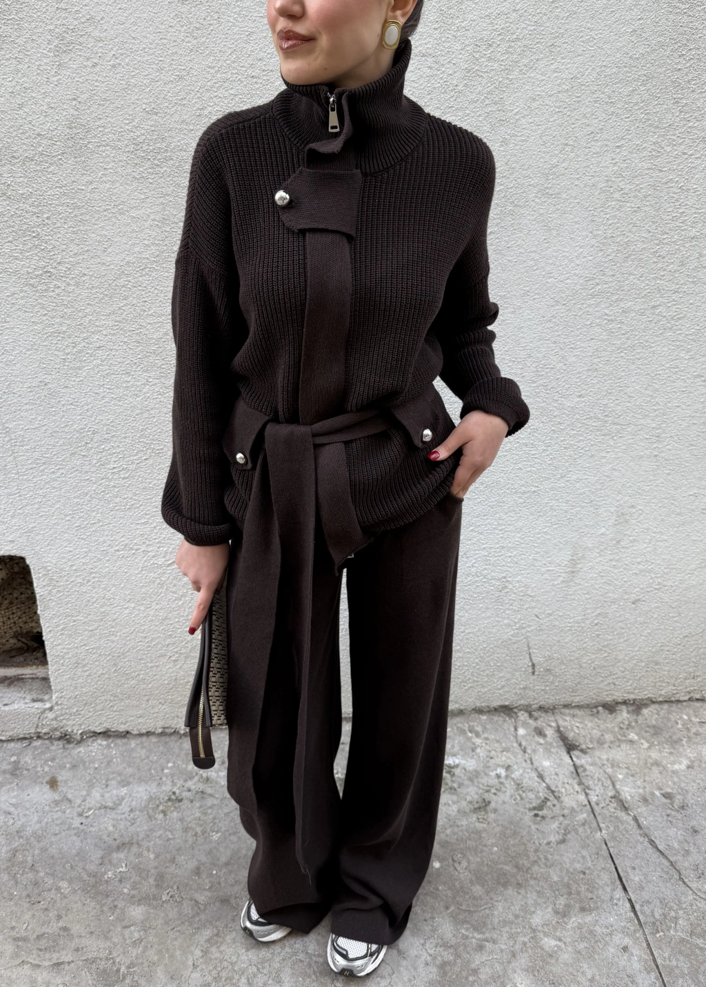 Dik Yakalı Kuşaklı Triko Takım Vizon