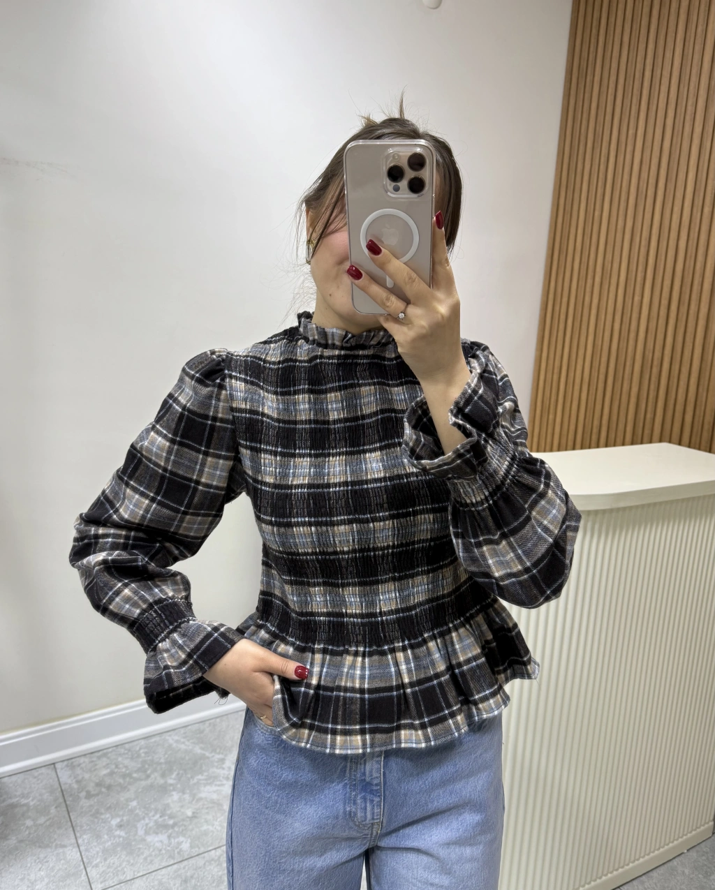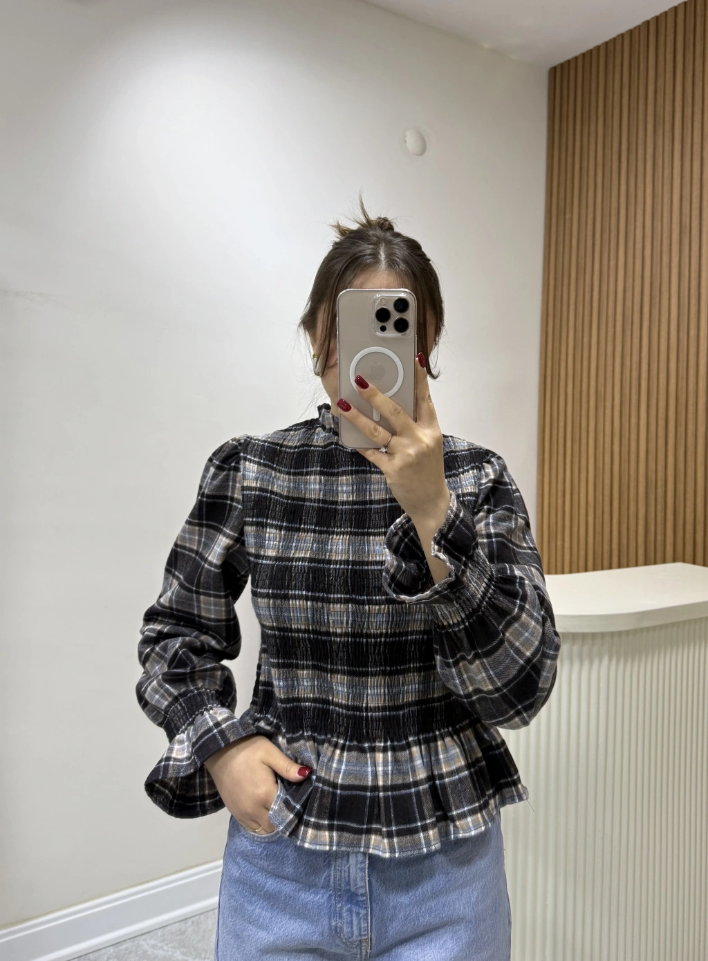 Ekose Desen Balon Kol Bluz