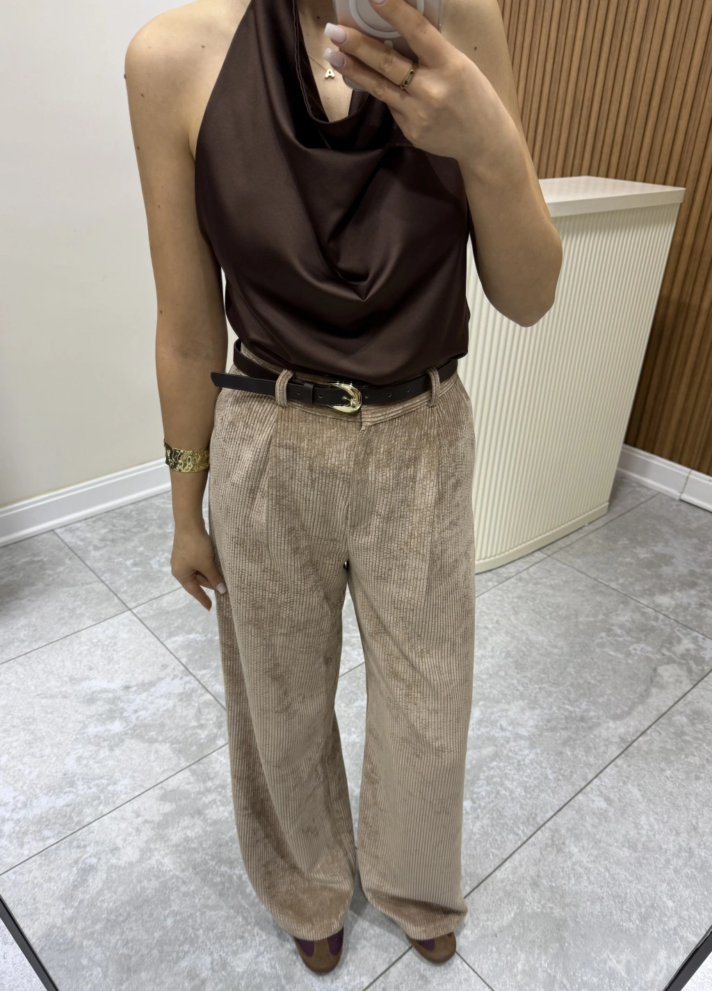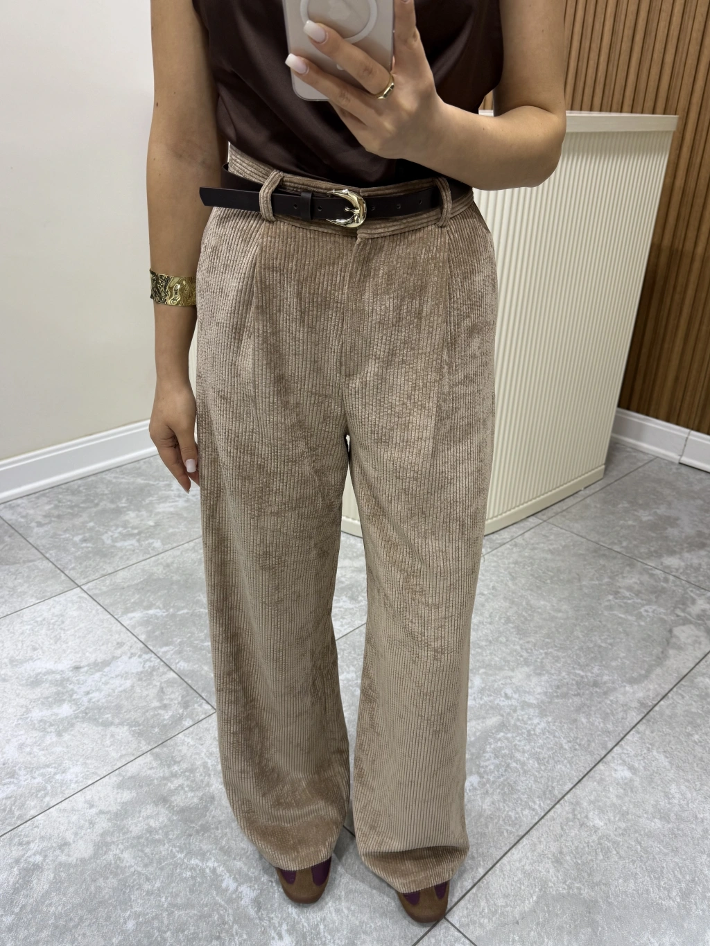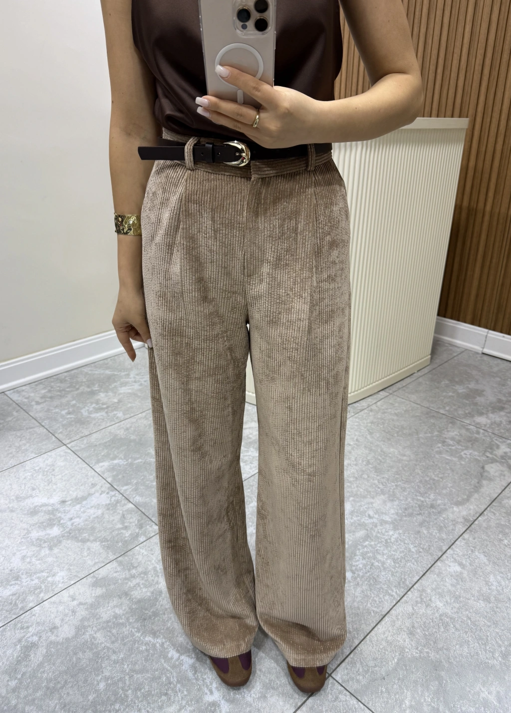 Kemerli Kadife Pantolon Camel