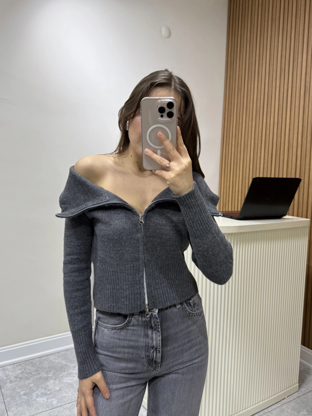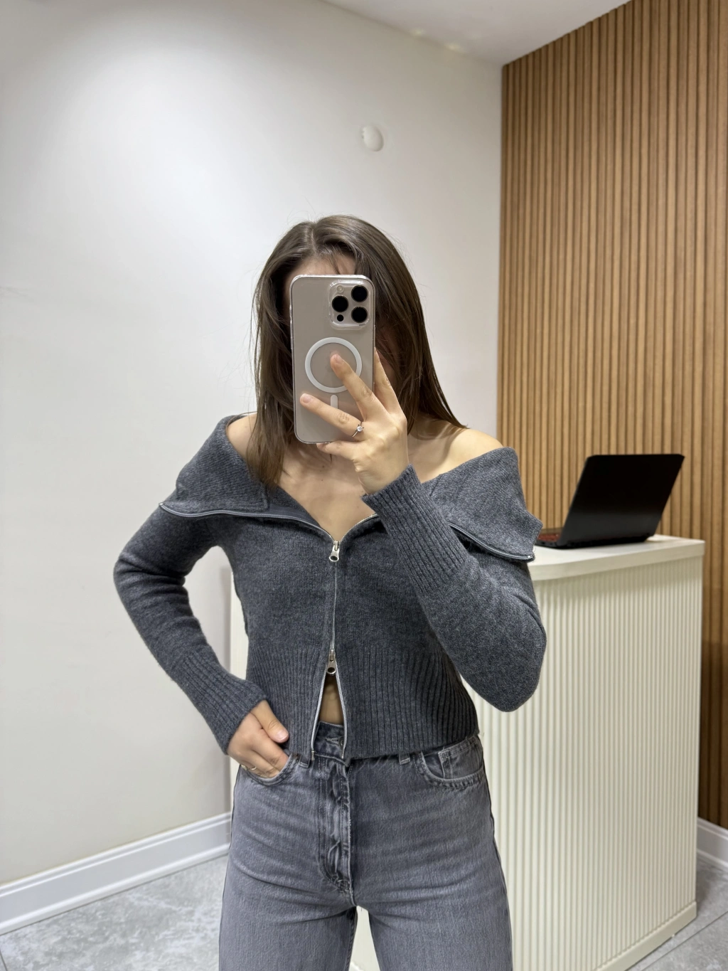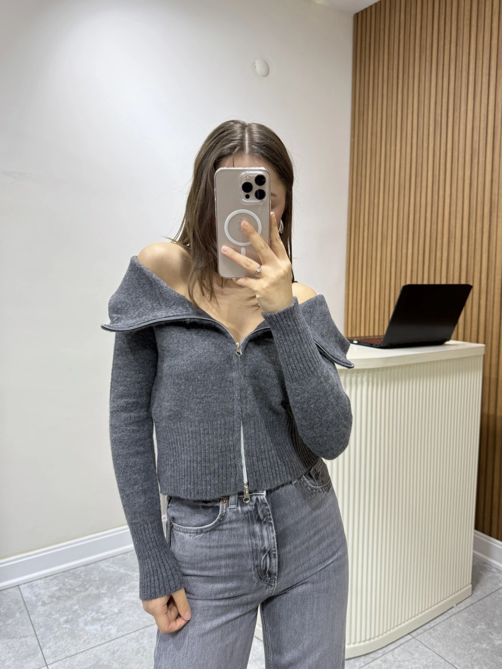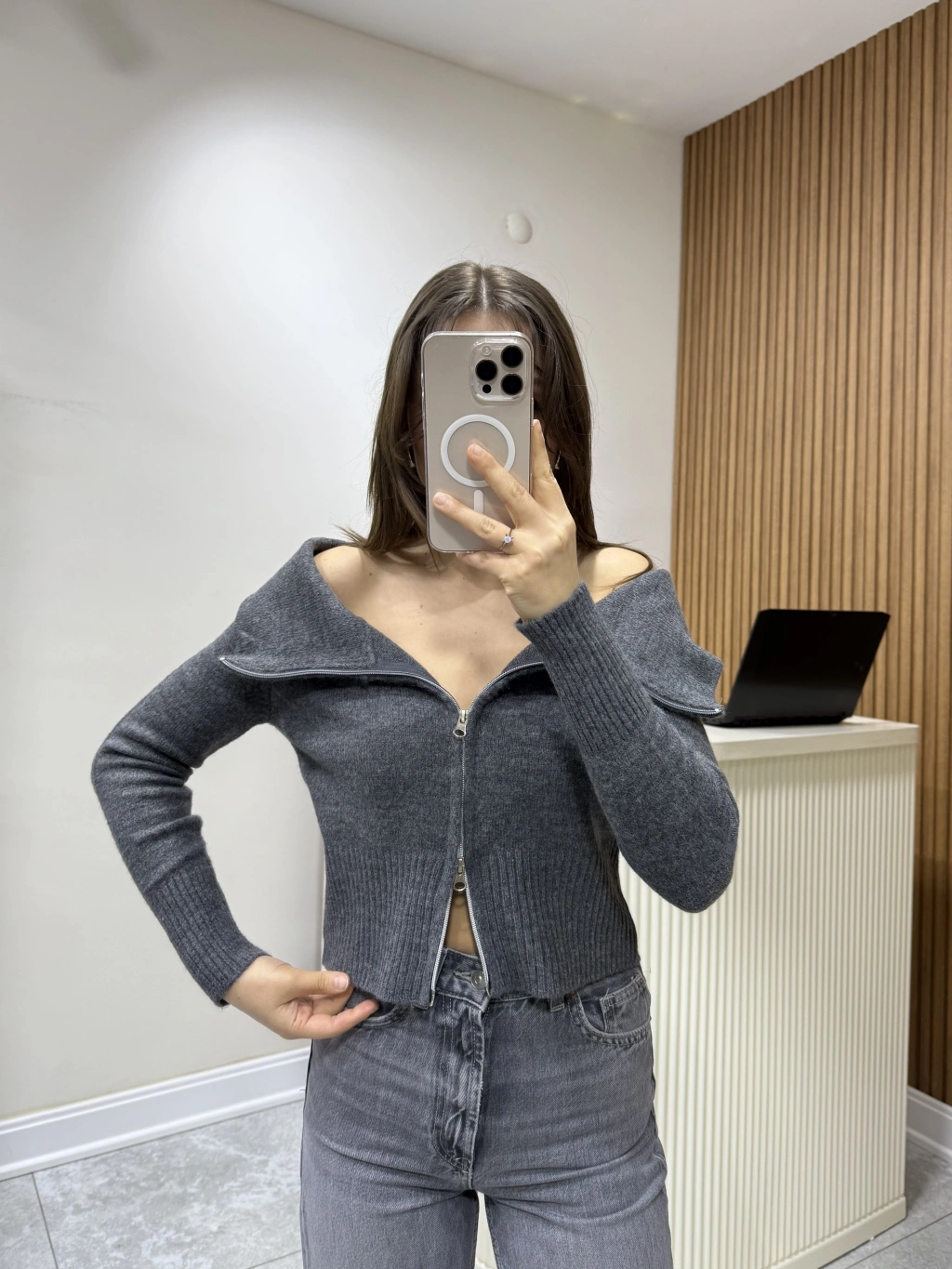 Madonna Yaka Fermuarlı Triko Hırka Gri