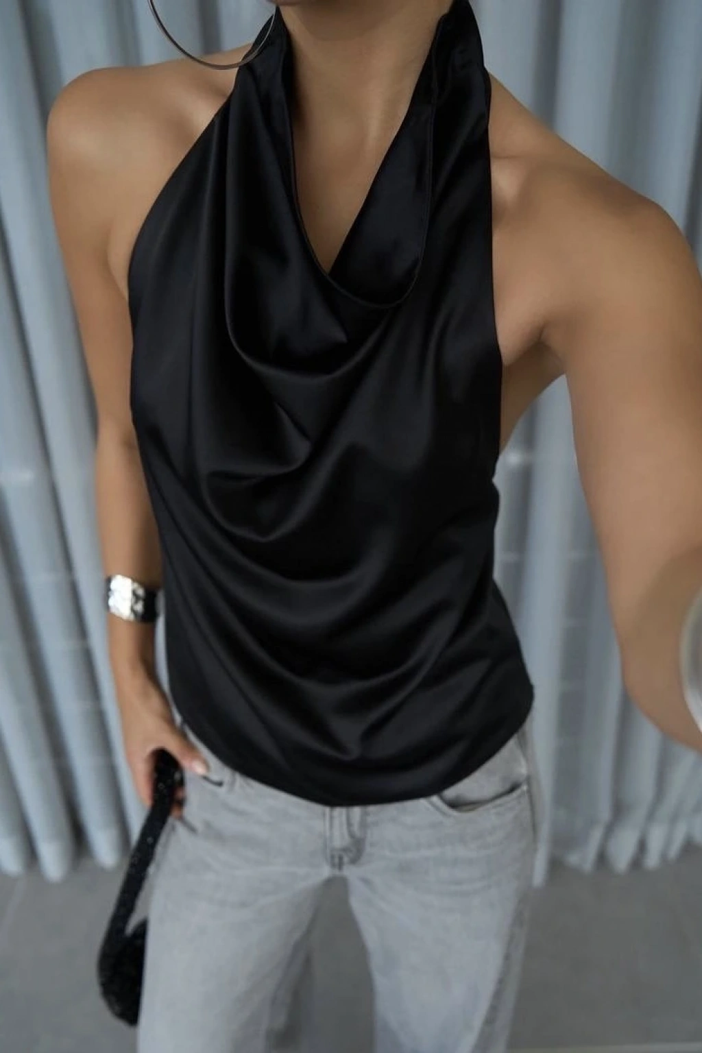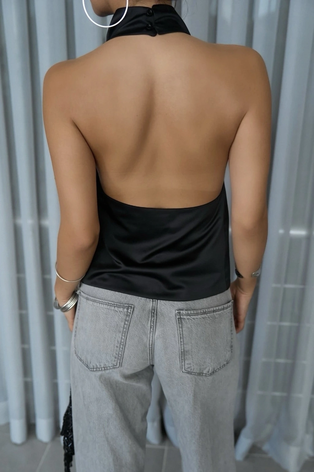 Degaje Yaka Sırtı Açık Saten Bluz Siyah