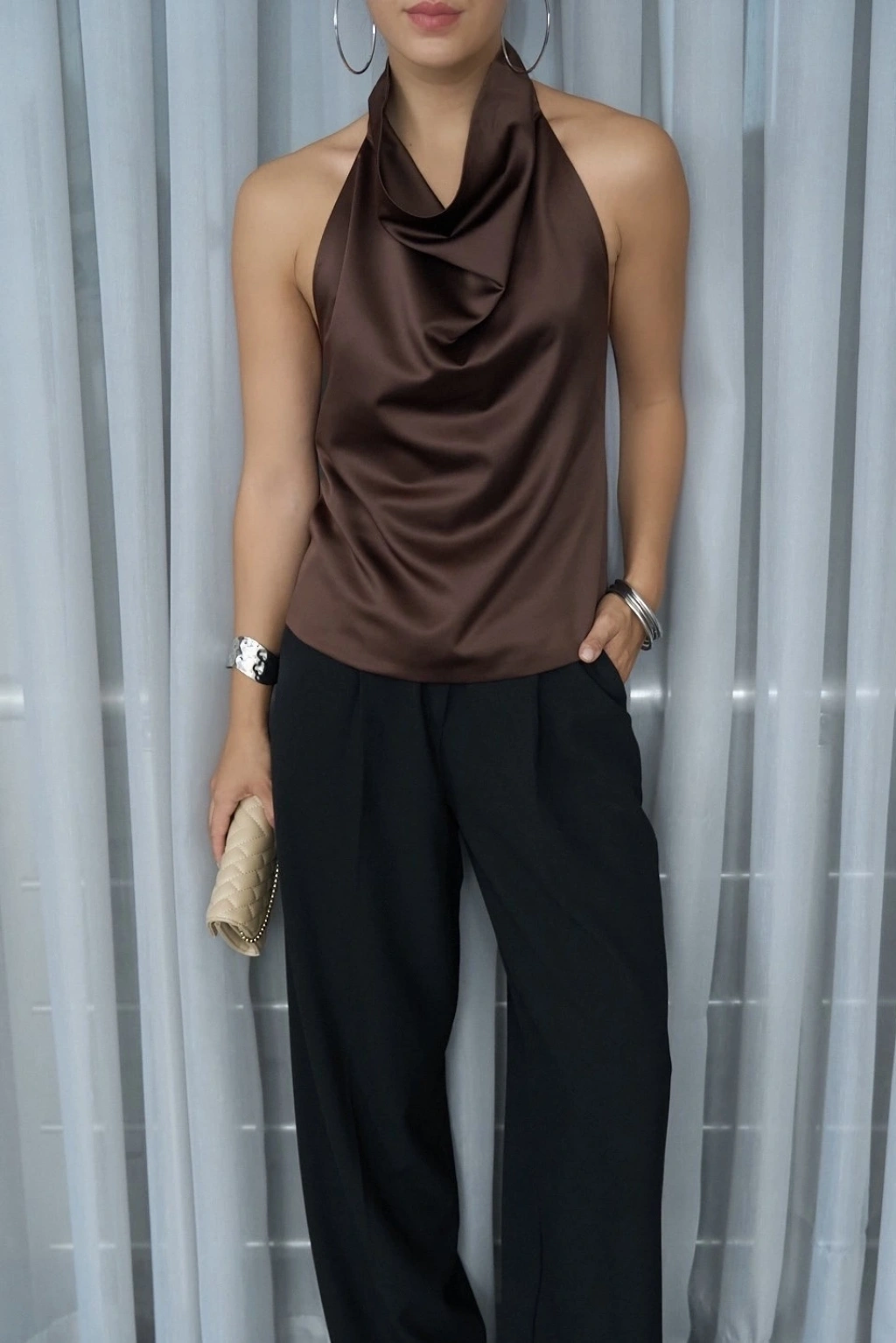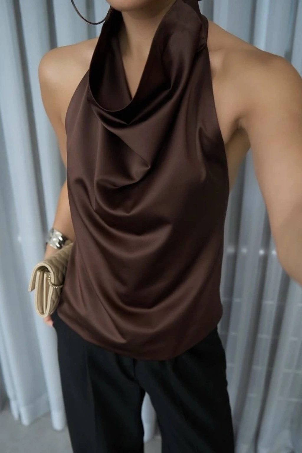 Degaje Yaka Sırtı Açık Saten Bluz Kahve