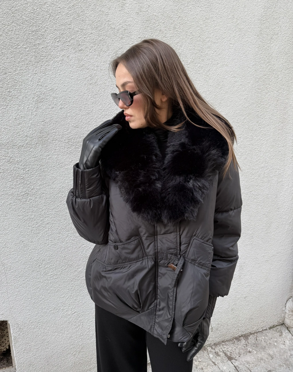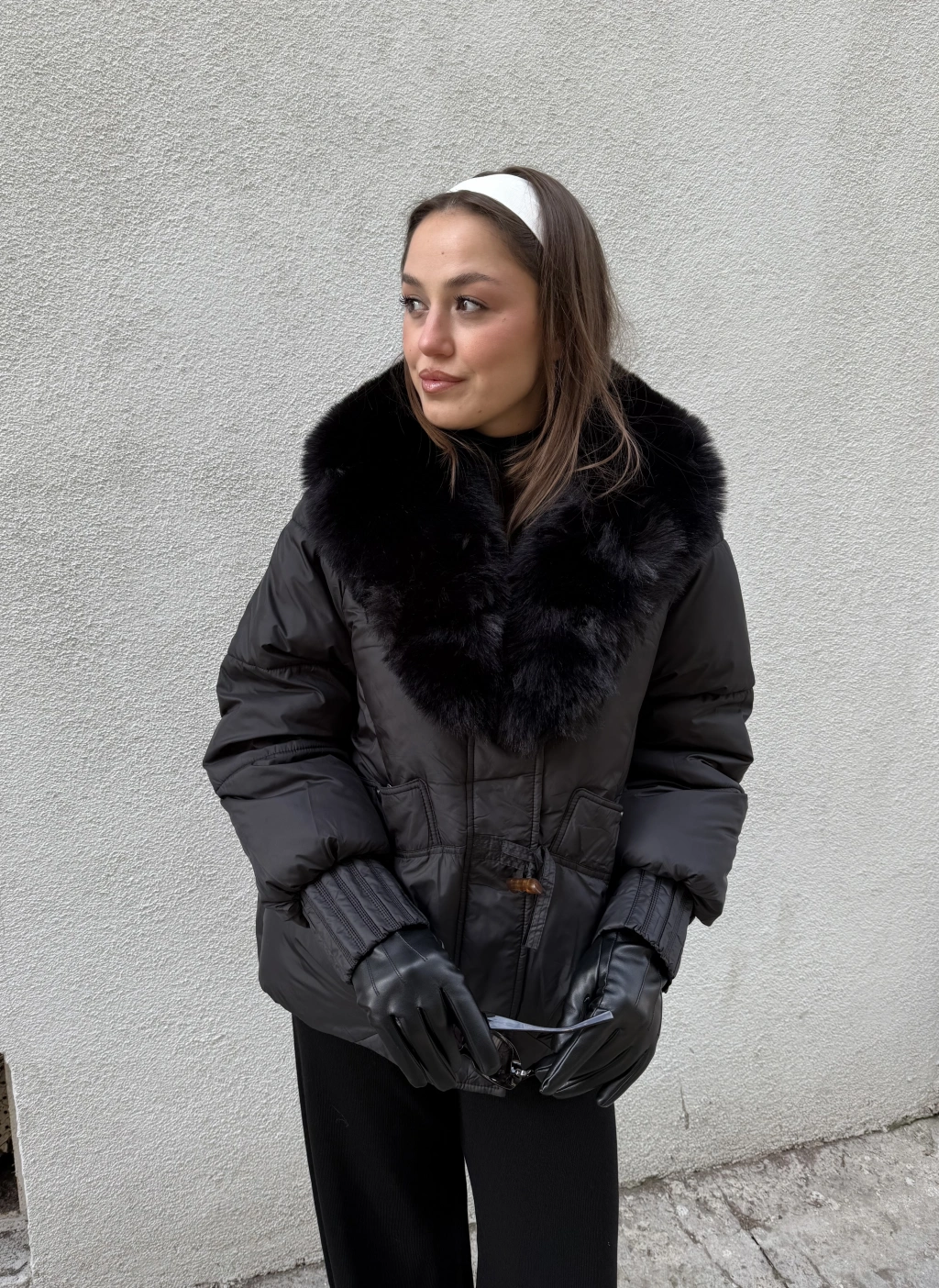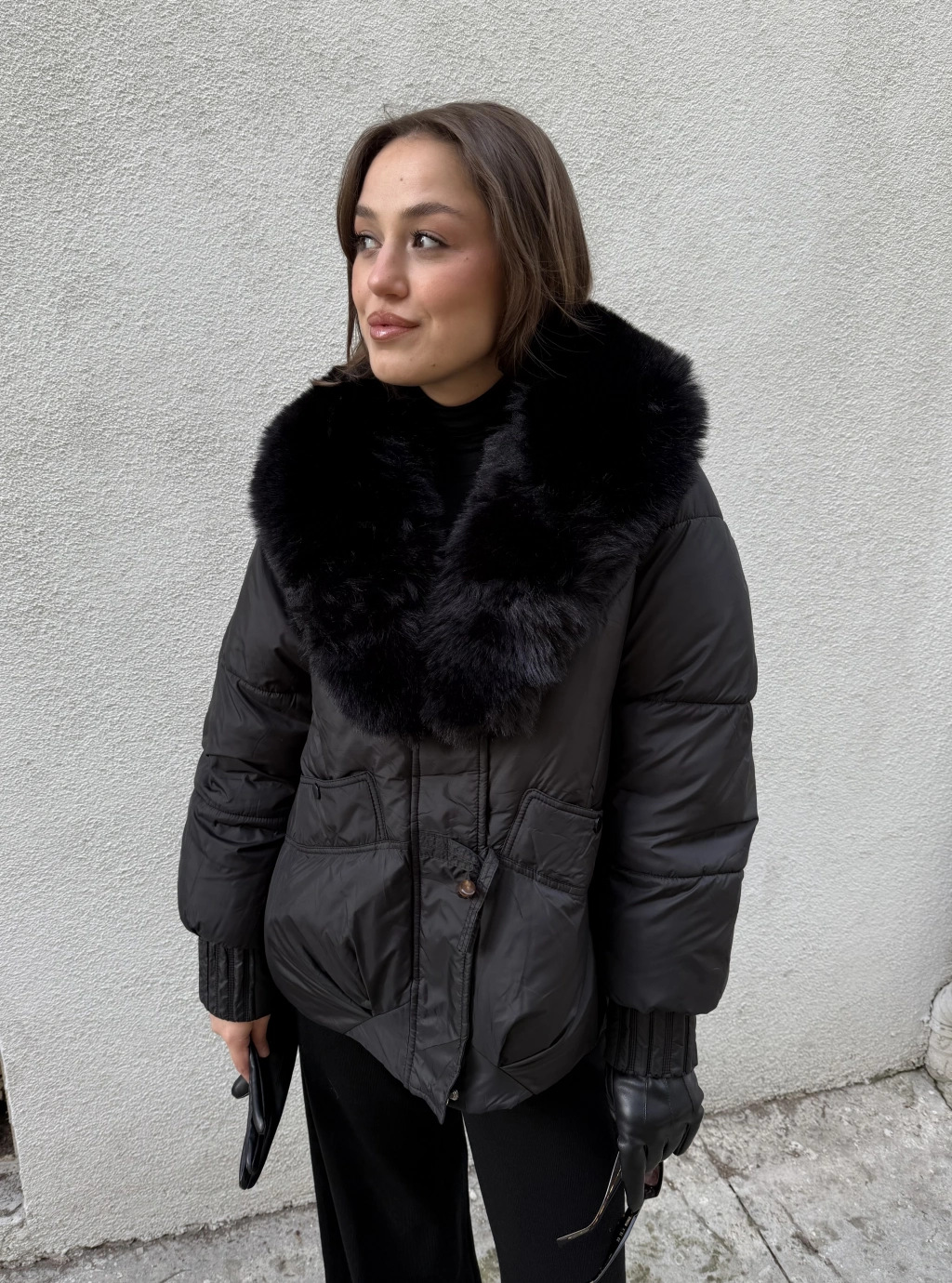 Yakası Kürk Detaylı Şişirme Mont Siyah